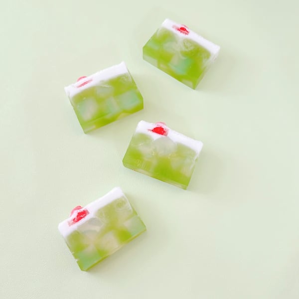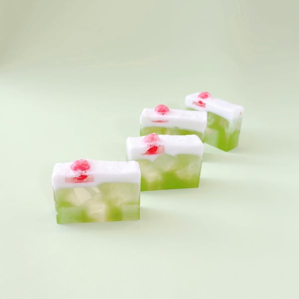 鮮やかなグリーンの透明石けんに氷を散りばめ、ふんわりとしたクリーム風の石けんをのせました。